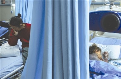 媛媛躺在病床上紧闭着眼睛,身体在发着高烧。奶奶在一旁看着很无助