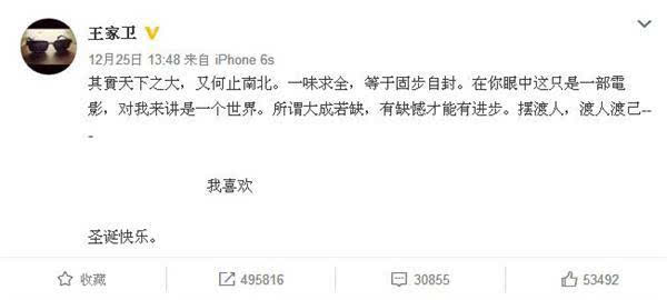 所谓大成若缺,有缺憾才能有进步,渡人渡己,王家卫表示喜欢自己的电影。