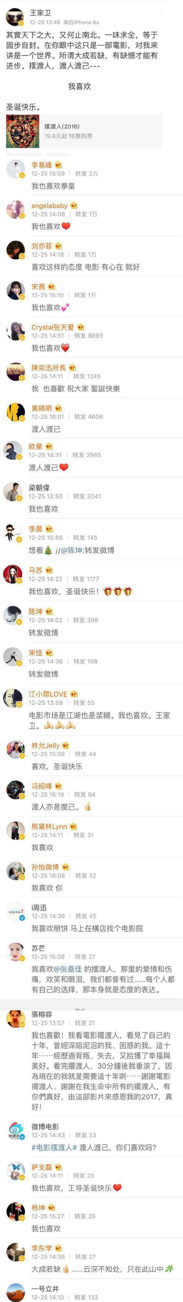 王家卫的电影很有艺术性,不仅经典,且每一帧都美到可以用来直接当壁纸。但最近王家卫新作《摆渡人》却出乎意料地被许多人说成是年度最佳烂片,一向载誉无数的王家卫突然被外界批评得一无是处,对此他用一条微博捍卫自己的电影,没想到大半个娱乐圈明星纷纷站出来力挺。